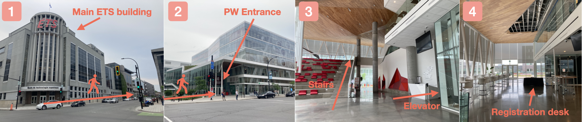 The images below show how to get to the Project Week 43 conference room. If you Google “ETS”, it will take you to the main building of the university (1). You need to walk about 200 meters to get to the building called “Maison des étudiants” (2). Enter the building and either climb the stairs or take the elevator on the right to reach the second floor(3). From there, you should easily find the registration desk.